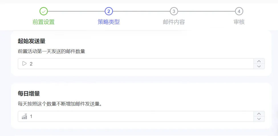 如果您使用新创建的邮件帐户,选择是显而易见的。渐进式策略专为新邮箱帐户设计,可逐渐增加发送的邮件数量。 您可以从每天 2-5 封邮件开始,系统会逐步添加更多邮件,直到您达到最大发送限制,每天最多可以发送 40 封邮件。