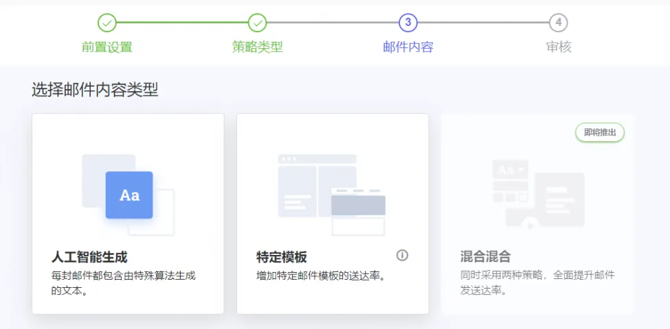 现在您面临着另一个可供选择的选项。 您可以为您的电子邮件选择内容类型——人工智能生成的或者特定模板的。