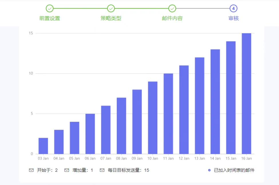 如果您的邮箱列表中有大量高质量的潜在客户,您可能需要更多的时间来确保取得最佳效果。我们建议在进行 8-12 周的预热后再发送您的邮件营销活动。这种耐心的策略有助于确保您的邮件能够在投放时取得最佳的送达和反馈结果。