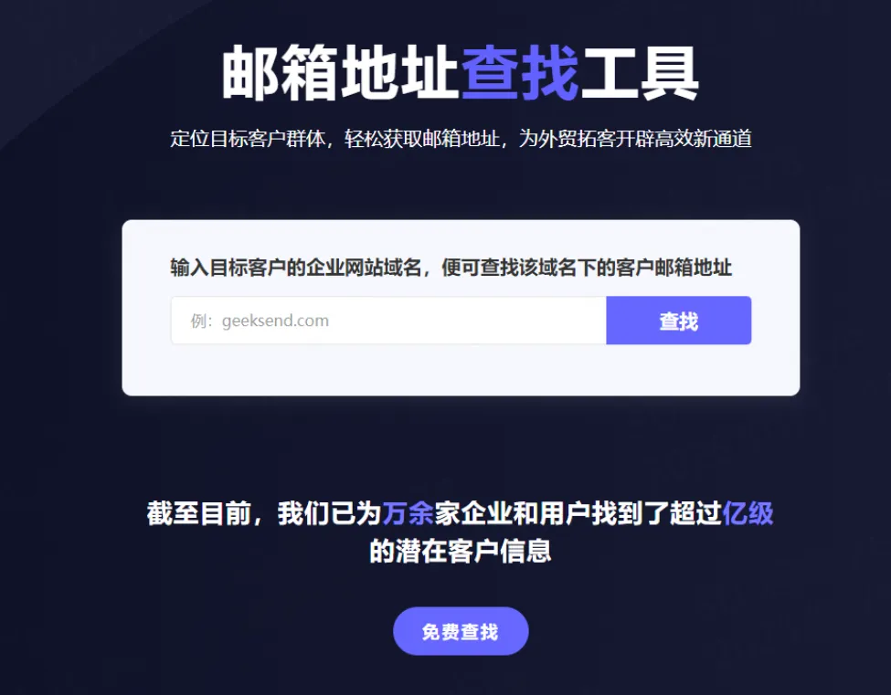 市面上存在诸多专业的电子邮件地址查找工具,它们依托庞大数据库与智能算法,能帮助企业快速查找特定个人或企业的邮箱地址。例如:Geeksend邮箱查找工具,庞大的潜在客户信息库,多维度的查找方式,可以完美满足各种行业的业务需求。Geeksend邮箱查找工具拥有强大的数据库作为坚实支撑,因而能够获得更高的确定性。相比之下,其他查找工具则可能存在较高的风险。Geeksend邮箱查找工具的数据库经过精心构建和不断优化,确保了数据的准确性和可靠性。凭借这一优势,Geeksend邮箱查找工具能够为用户提供更加精准、稳定的服务,降低决策过程中的不确定性。