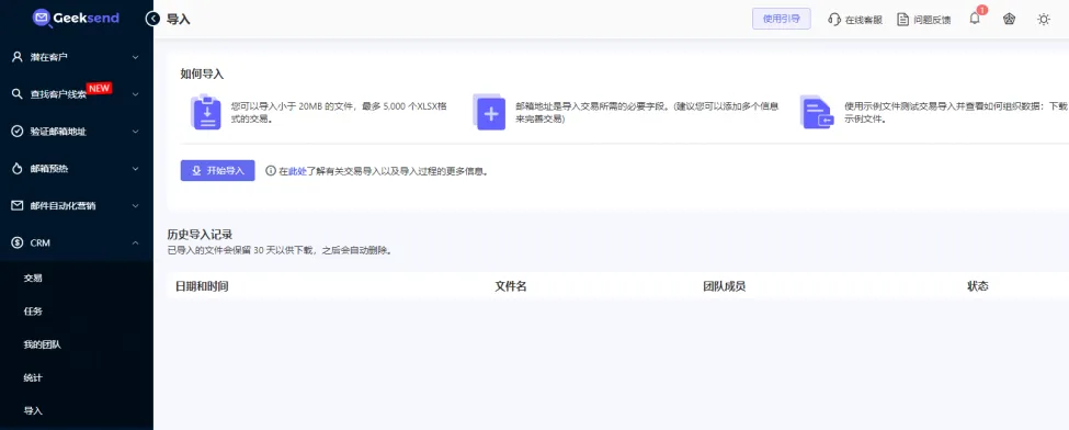 如果企业已经拥有成熟的客户信息列表,那么可以充分利用这一资源,直接将其导入邮件营销系统。例如,Geeksend邮件营销 支持从 EXCEL 和 CRM 中的联系人列表导入,这一方式极大地免去了手动整理繁杂客户信息的过程,为企业节省了大量的时间和人力成本。(可以参考文章Geeksend邮件营销如何将潜在客户数据导入到CRM中)