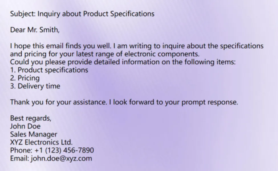 ● 开头段落:简要说明邮件目的。例如:“I hope this email finds you well. I am writing to inquire about...”。