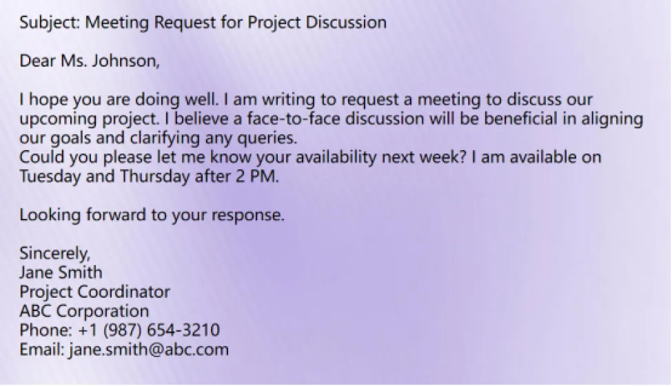 以下是一个英文邮件的范例,展示了如何结合上述格式要求撰写一封专业的商务邮件: