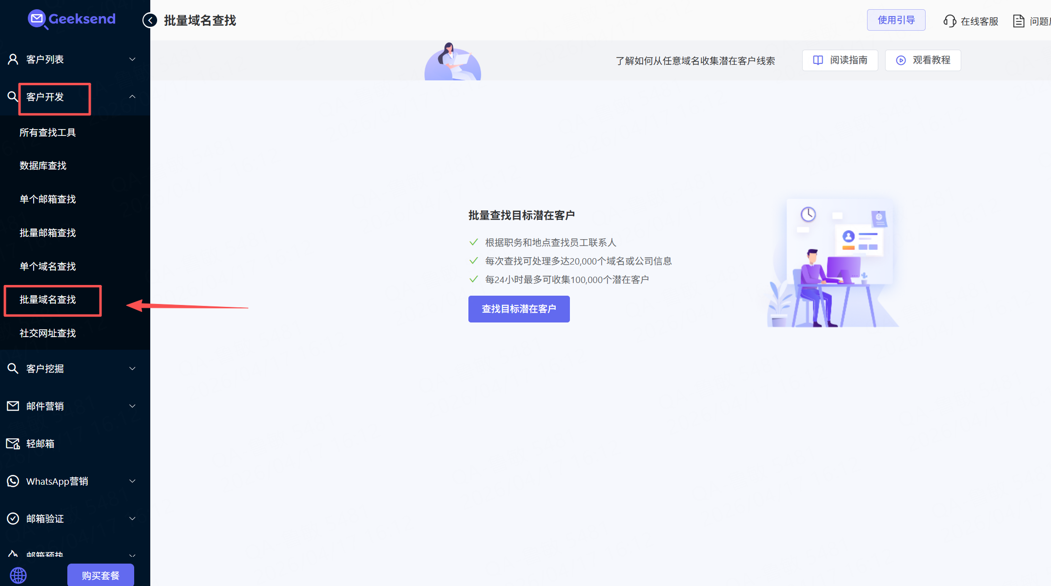 在“客户开发”侧面菜单中,选择“批量域名查找”以打开查找设置界面。
