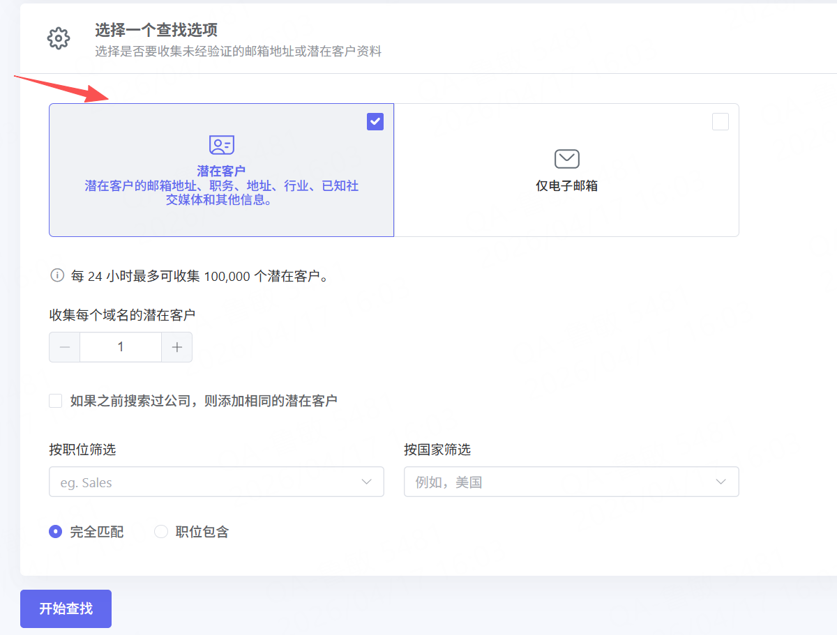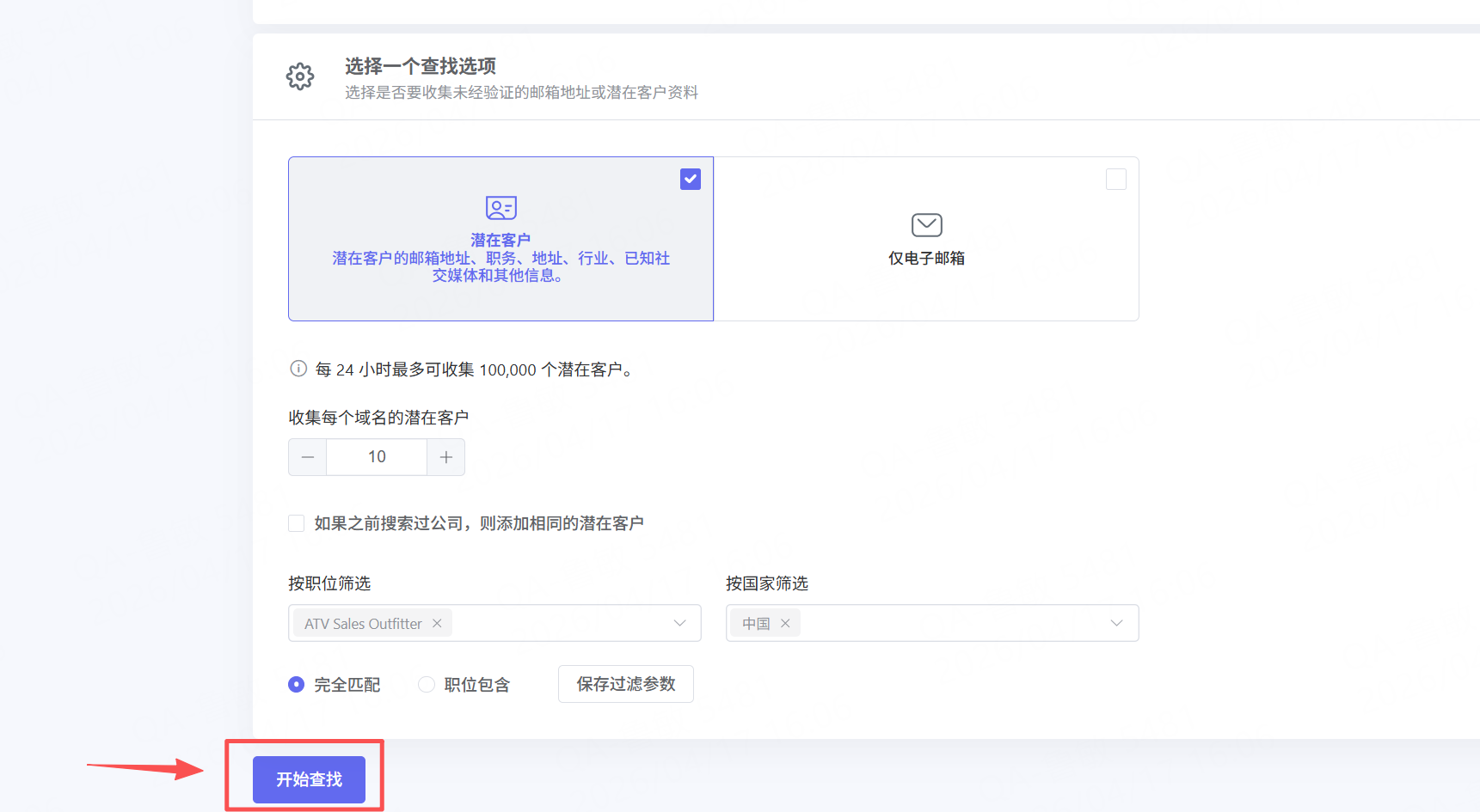 这取决于您选择的搜索选项。对于潜在客户选项,每 1 个潜在客户消耗1 个积分。对于仅电子邮箱选项,每20个邮箱消耗1个积分(不满20按20计算,依此类推) 。